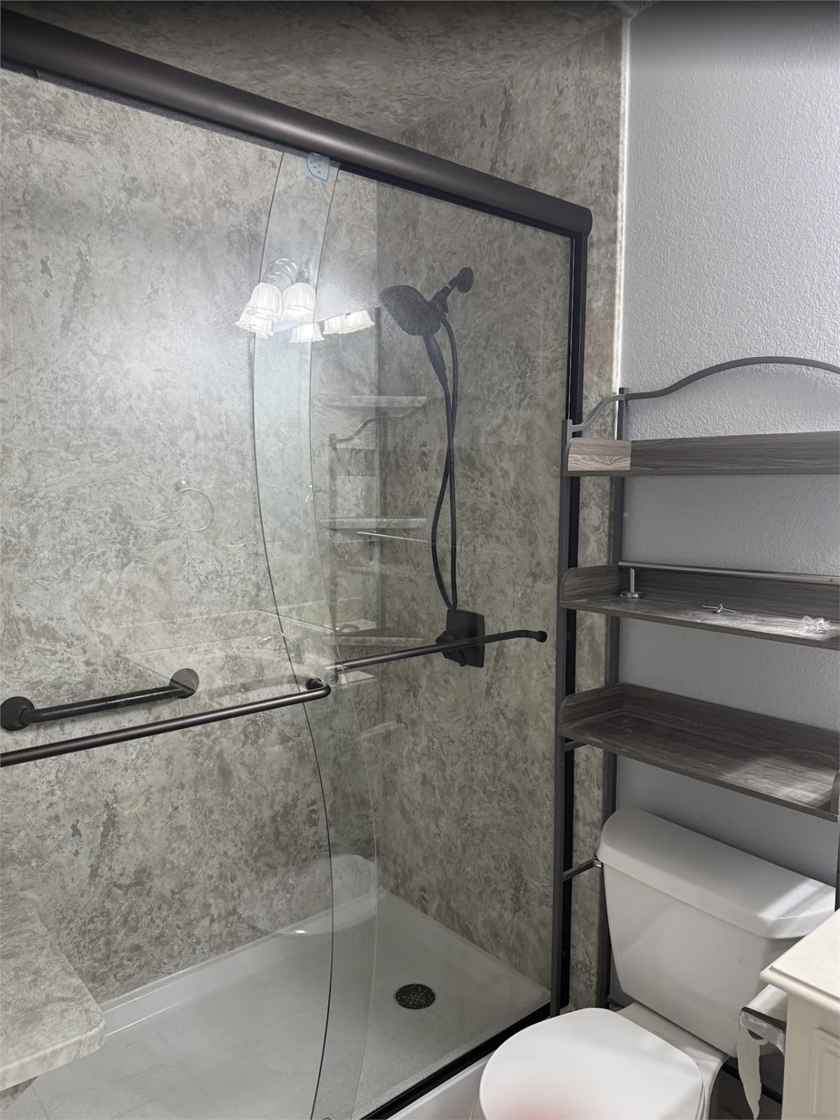 - Wall System: Luxury solid-surface panels in Gray Onyx (stone-look gray with vertical veining)